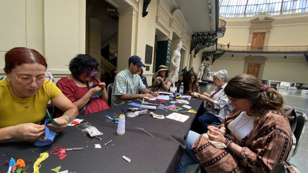 Uno de los momentos más significativos de la jornada ocurrió en el Hall Central con el taller “Hilvanando historias 0+”, un bordado colectivo en memoria de mujeres fallecidas por complicaciones del SIDA, facilitado por Patricia Ruiz. La instancia propuso una dinámica sensible que permitió entrelazar experiencias personales y memoria colectiva: cada puntada funcionó como un gesto de recuerdo, duelo y reconocimiento. El bordado, lejos de ser solo una práctica artesanal, se convirtió en un lenguaje común para contener reflexiones, nombrar ausencias y sostener afectos, reafirmando que el cuidado también se construye desde prácticas comunitarias.